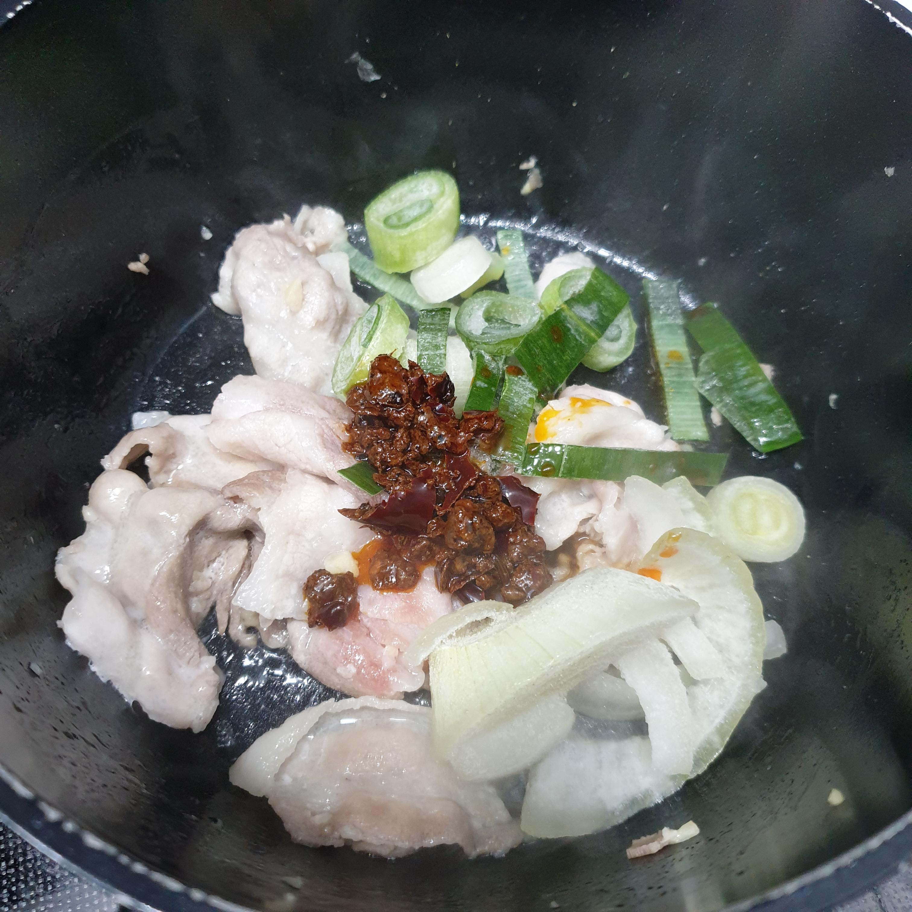1. 우삼겹 (또는 차돌박이)와 마늘을 넣고 볶아주세요.