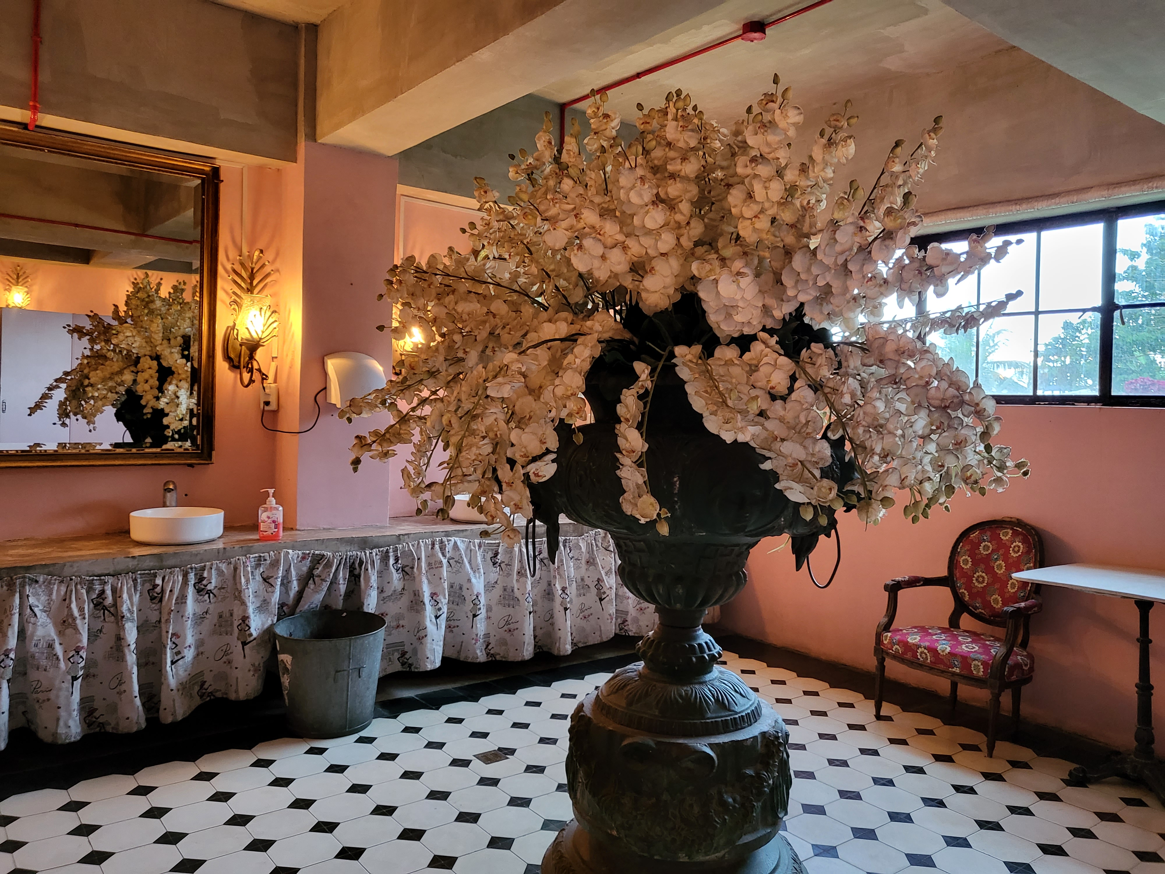 화장실 가운데 큰 조화가 자리를 차지하고 있고 주황빛의 은은한 불빛이 전체적인 분위기와 정말 잘 어울렸습니다.